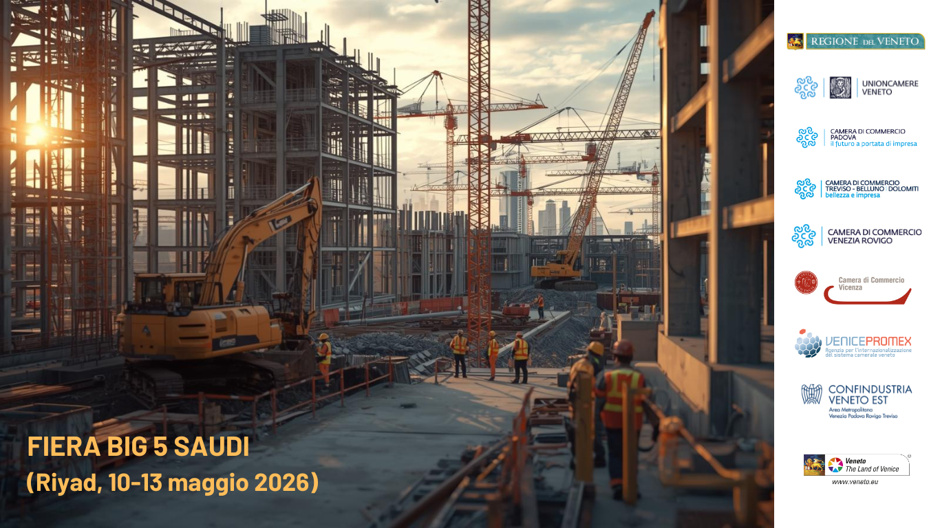 Venicepromex, nell’ambito del programma di interventi per la promozione economica e l’internazionalizzazione del 2025, in collaborazione con la Regione e Unioncamere del Veneto, organizza una collettiva aziendale in uno stand istituzionale condiviso alla 14^ edizione della Fiera “Big 5 Saudi” - Fase 2. L’organizzazione della collettiva è prevista nella settimana dal 10 al 13 maggio 2026 presso il Riyadh Front Exhibition & Conference Center di Riyad, Arabia Saudita e vede Venicepromex, insieme al sistema camerale veneto e a Confindustria Veneto Est, impegnata a promuovere le eccellenze venete nel settore delle costruzioni e delle infrastrutture con l’intento di facilitare l’accesso delle imprese venete a uno dei mercati più strategici del Medio Oriente.