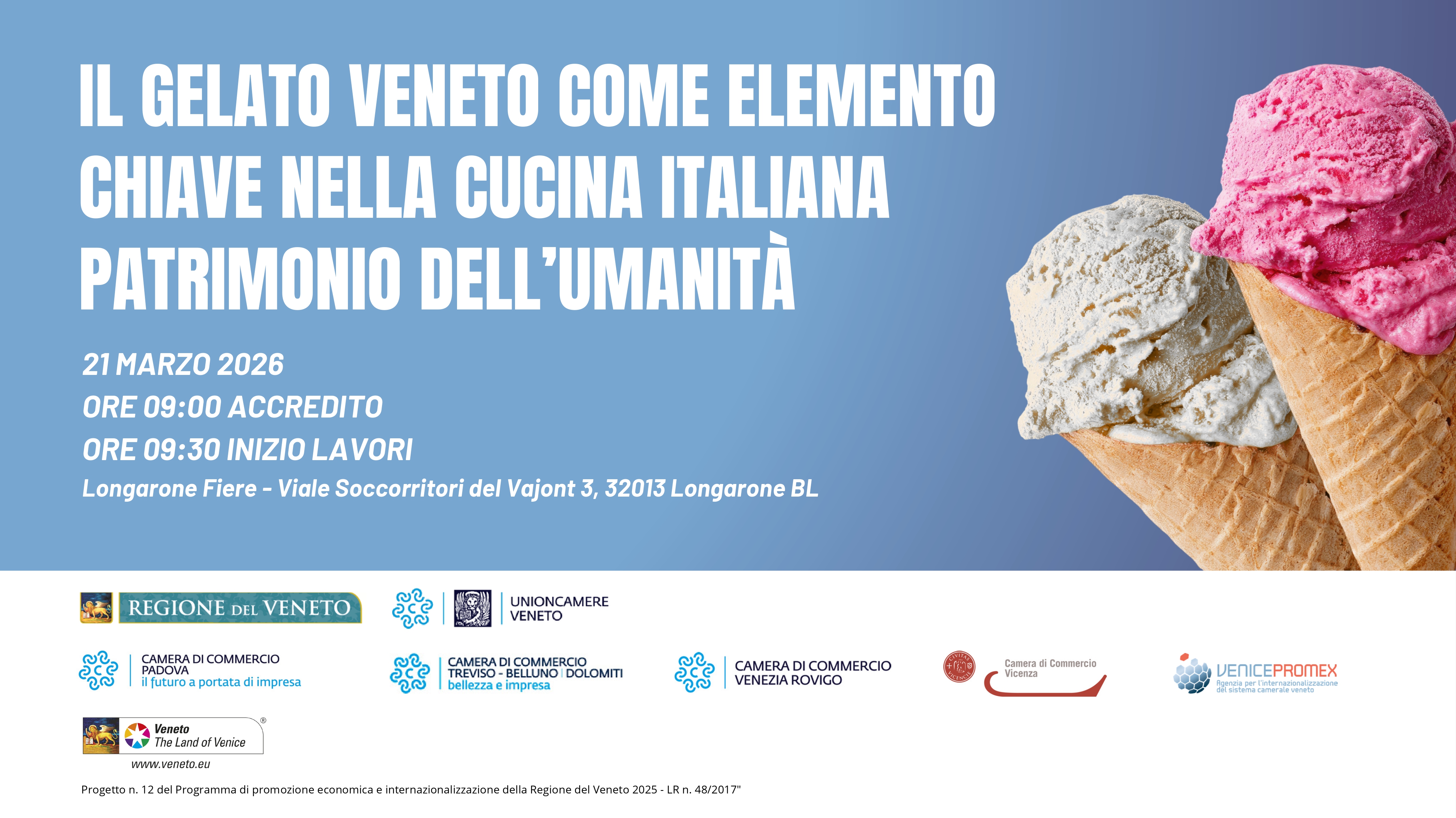 Venicepromex ha il piacere di invitarti all'evento gratuito "Il gelato veneto come elemento chiave nella cucina italiana patrimonio dell’umanità", che si terrà sabato 21 marzo 2026 presso Longarone Fiere Dolomiti, Sala Congressi – 1° piano (Viale Soccorritori del Vajont 3, 32013 Longarone).