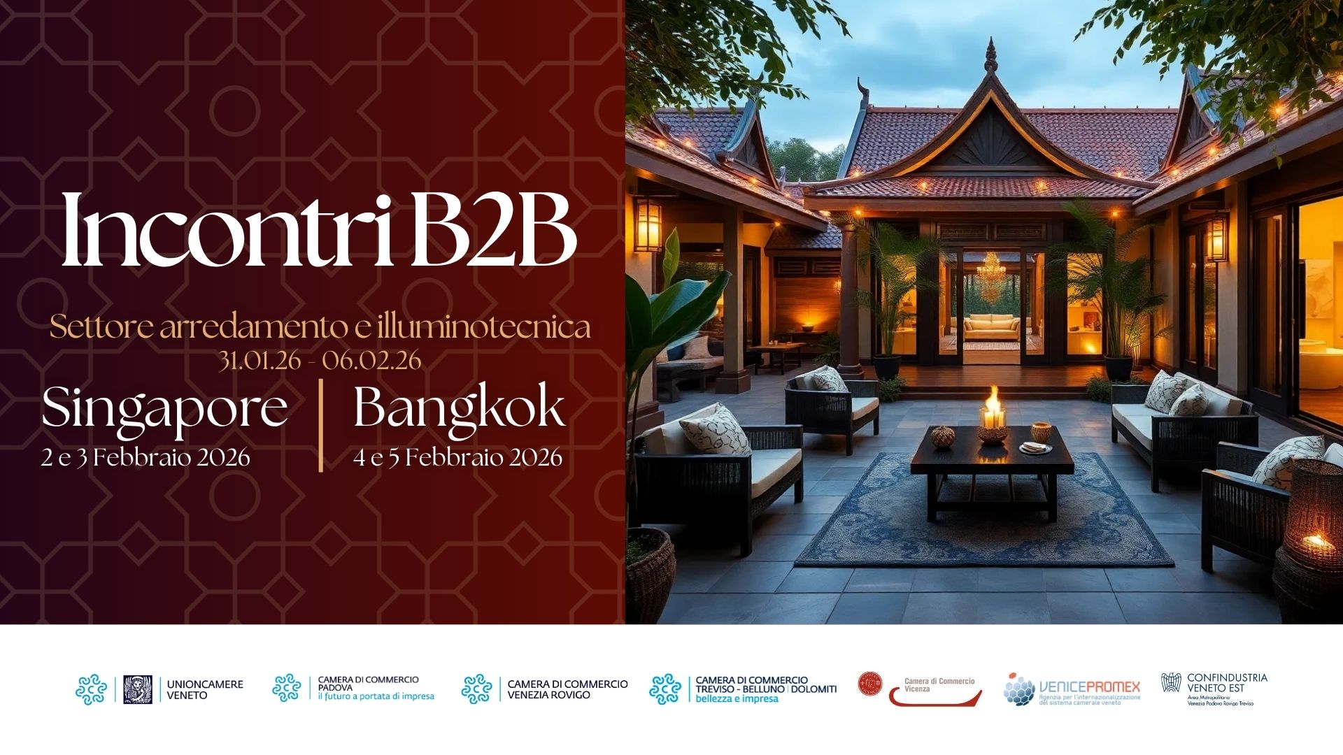 Nell’ambito del Programma promozionale 2025 (legge regionale 48/2017) della Regione del Veneto, Venicepromex Agenzia per l’internazionalizzazione S.c.a.r.l promuove il Progetto Regionale 10/2025 in collaborazione con Confindustria Veneto Est, la ICCS-Italian Chamber of Commerce in Singapore e THICC - Thai Italian Chamber of Commerce.