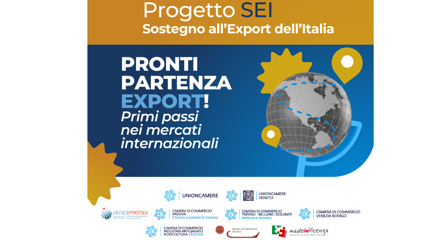 Nell'ambito Progetto SEI, Venicepromex - in collaborazione con Unioncamere del Veneto, le Camere di Commercio di Padova, Treviso-BellunoIDolomiti, Venezia Rovigo, Verona, Vicenza e Made in Vicenza - organizza il percorso formativo PRONTI PARTENZA EXPORT! Primi passi nei mercati internazionali, 5 incontri GRATUITI dedicati alle imprese che ancora non esportano pur avendone le potenzialità o che operano occasionalmente nei mercati esteri.
